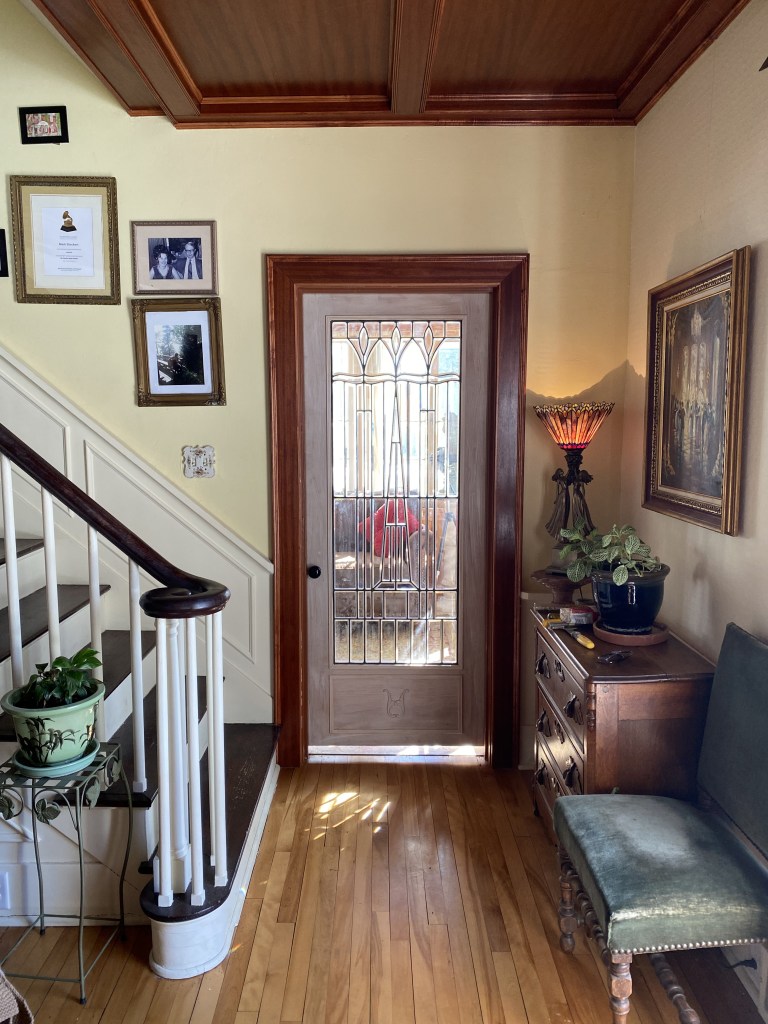 Fun project where I helped a friend take an antique beveled glass window and get into a door and then on the door leading from the living room to the sun room.